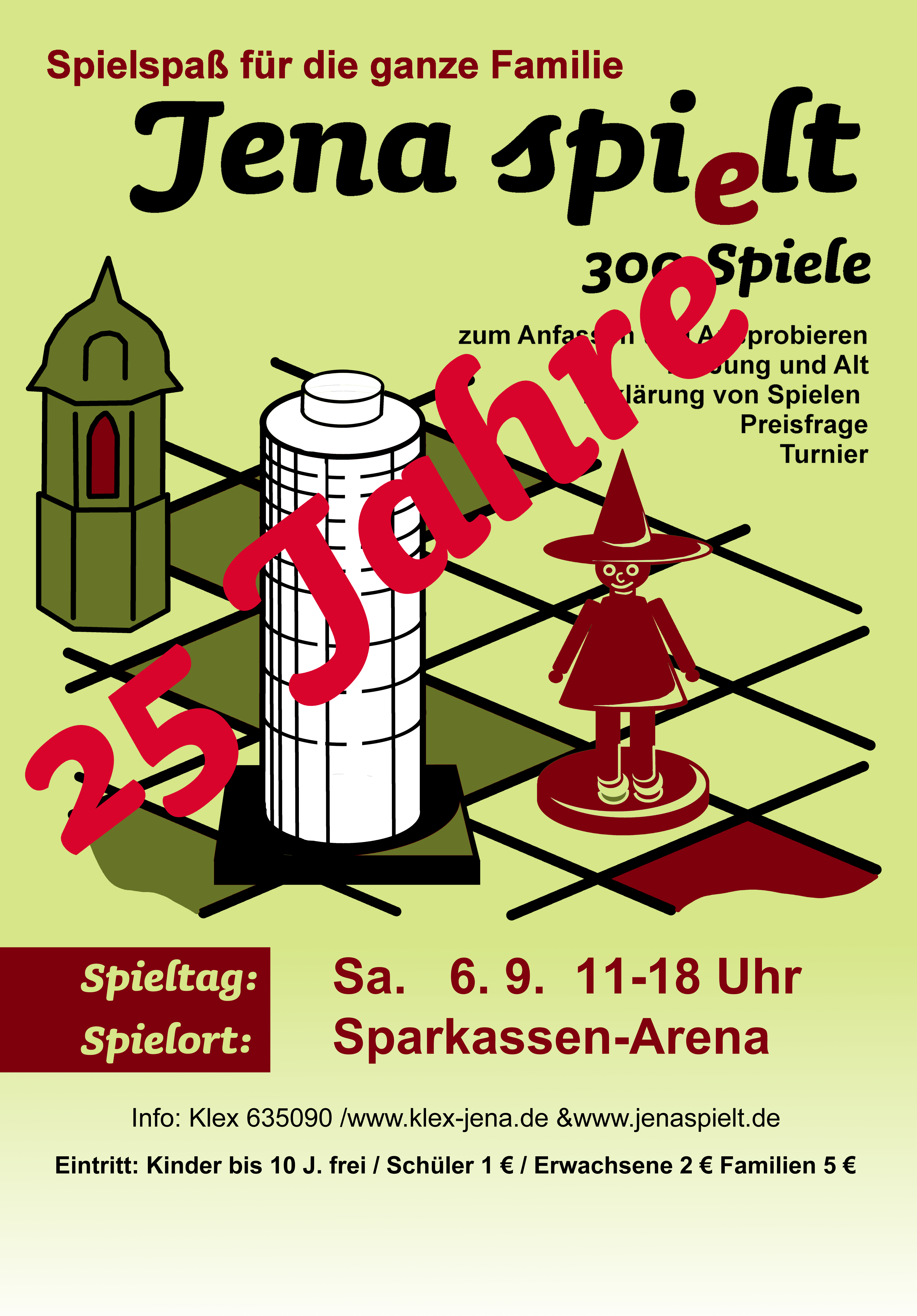 Eimal im Jahr gibt es in Jena für Jung und Alt die Möglichkeit, nach Herzenslust neue Brettspiele auszuprobieren - und das jetzt seit 25 Jahren. Es stehen über 300 Spiele und viele spieleerfahrene Helfer zur Verfügung, um bei der Auswahl zu beraten, Spielregeln zu erklären und manchmal auch mitzuspielen (nur Jens). Dabei steht der Spaß am Spielen im Vordergrund, aber wer gern eine Herausforderung sucht, kann an der Preisfrage oder kleinen Turnieren teilnehmen.