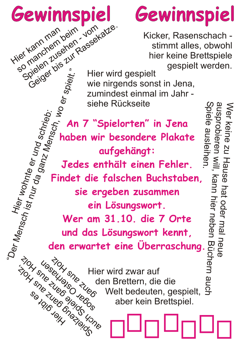 Unsere Werbe-Flyer sind im wahrsten Sinne eine Einladung zum Spielen. Seit mehr als 10 Jahren gibt es auf der Rückseite ein Spiel, spielbar mit haushaltsüblichen Hilfsmitteln. Bis auf eine Ausnahme (2012) sind alle Spiele von Uli erdacht.