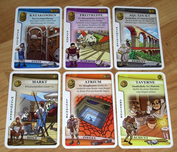 - Es gibt sehr viele Gebäudekärtchen, doch nur wenige davon kommen in den vier Runden ins Spiel. Dadurch ist jedes Spiel anders und jedes Mal muss man eine neue passende Strategie suchen.