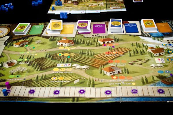 Ein wunderbares Bei-Spiel dafür ist Viticulture von Jamey Stegmaier. Ich besitze natürlich die Original-Kickstarter-Edition mit der Tuscany-Erweiterung - und natürlich mit den wunderschönen Metallmünzen. Inzwischen gibt es von Feuerland auch eine deutsche Version Viticulture Essential Edition sowie Tuscany Essential Edition und diverse Erweiterungen (Besuch aus dem Rheingau, In Vino Veritas).